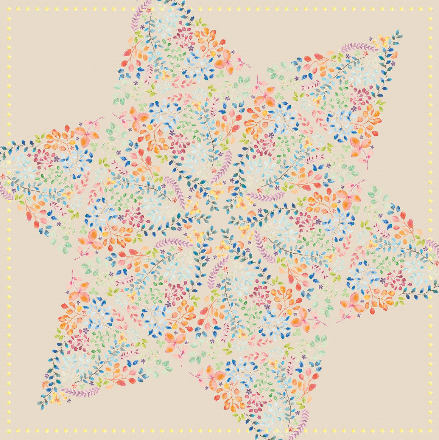 Tørklædet består af det smukkeste farvemiks af lavendel, lilla, orange, pink , røde, blå og gule nuancer på cafe latte-farvet bund. Tørklædet er super anvendeligt og elegant både sommer og vinter.