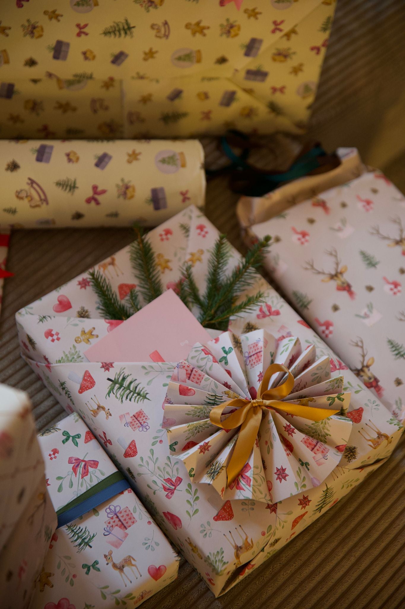 På gavepapiret finder du tryk af forskellige originalværker i akvarel – sat op i en grafisk komposition, der klæder gavepapirets format.