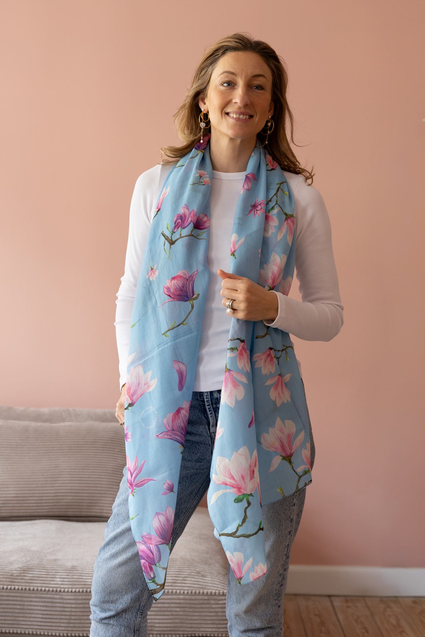 Magnolia Petit Blue Tørklædet i 100% bomuld består af det smukkeste farvemiks af rosa, hvide, lilla nuancer på en himmelblå bund. Tørklædet er super anvendeligt og elegant.