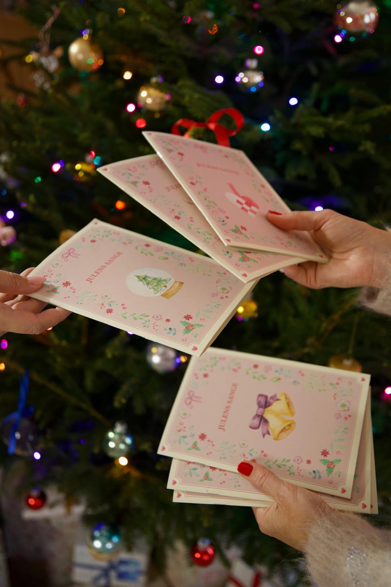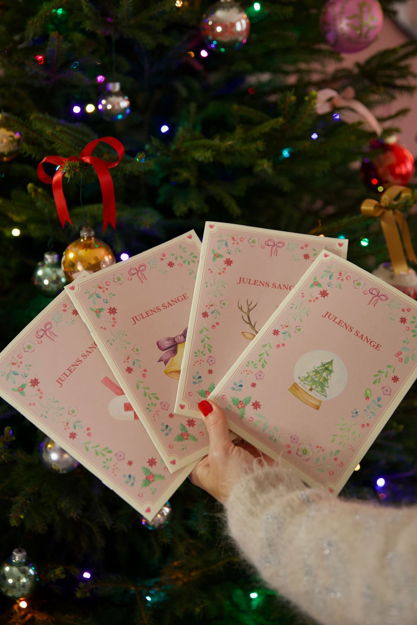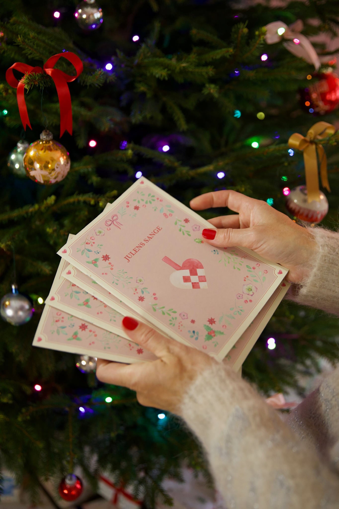 Hæftet indeholder julens sange, - både de familievenlige og traditionsbundne af slagsen. Inde i hæftet er der dekoreret med forskellige akvareller, der alle er originalmotiver malet af Annemette Voss Fridthjof, - og efterfølgende er de scannet ind i høj opløsning for bedst mulig gengivelse.
