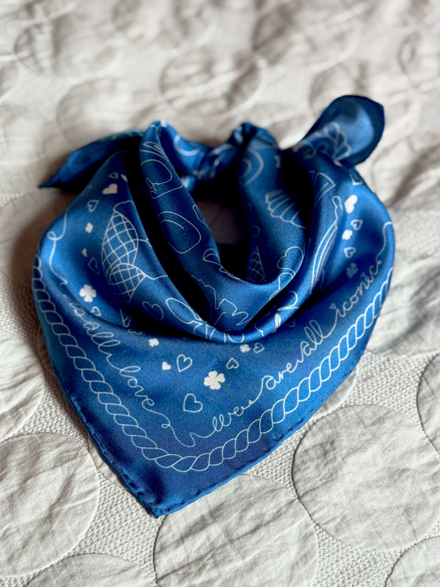 Tørklædet består af stærkt grafisk mønster bestående af søde og humoristiske ikoner, tegnet op digitalt, med udgangspunkt i nogle af ALL BY VOSS' mest anvendte akvarelillustrationer.