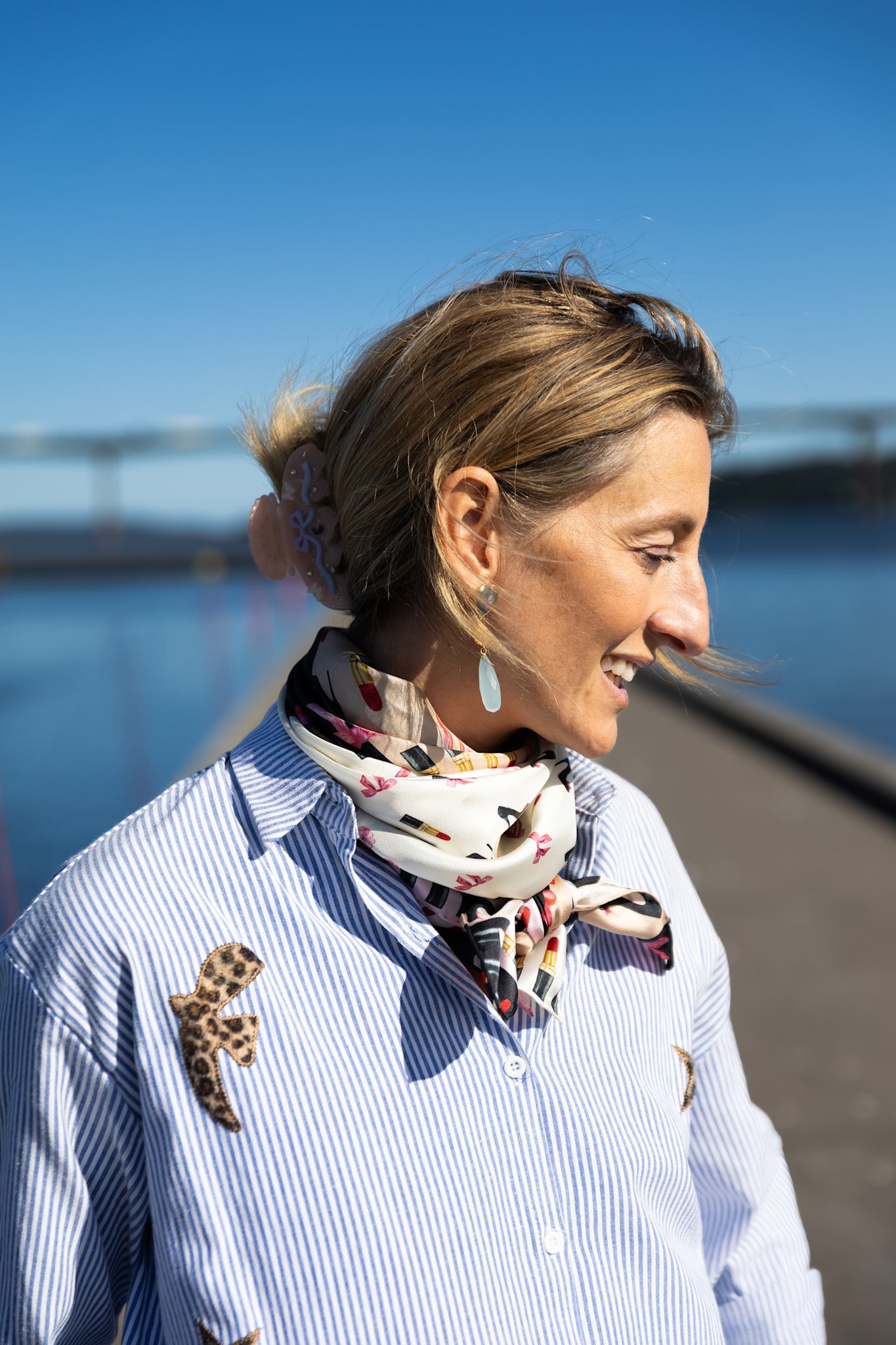 Langs kanten er silken rullet og håndsyet, hvilket giver et ekslusivt udtryk og en flot afslutning. Denne detalje er også med til at komplimentere de håndmalede akvareller, der er trykt på silken, og løfter tørklædet til et højt æstetisk niveau.