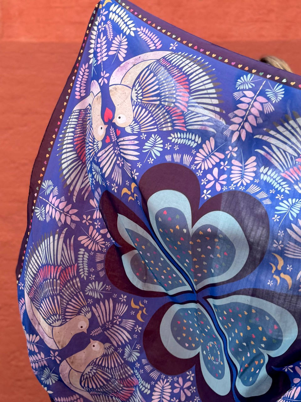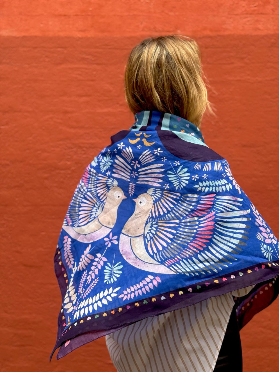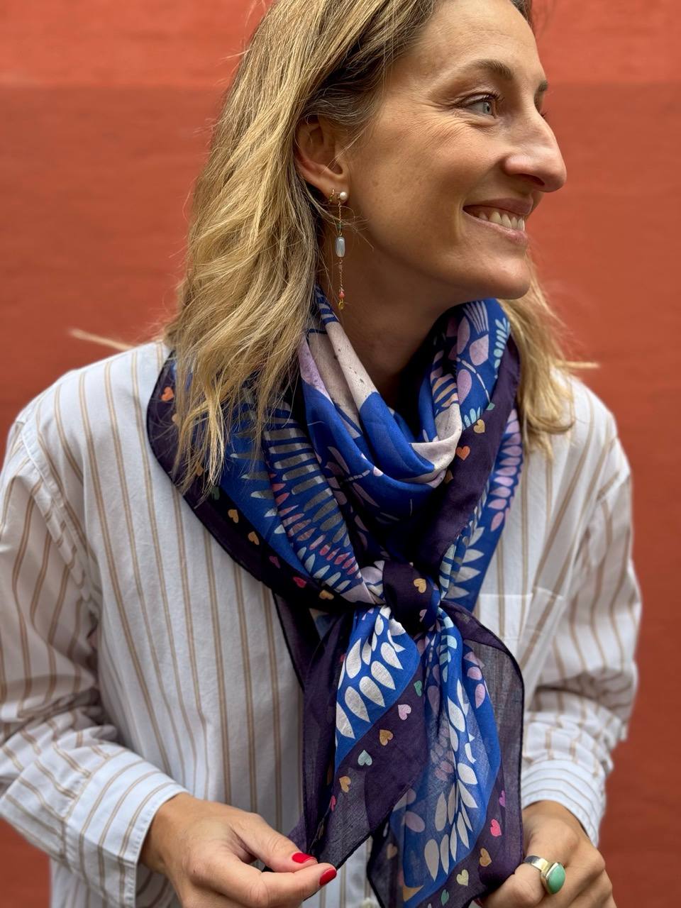 En skøn kombination af blå, blommefarvede og støvede grønne nuancer, smukt udsmykket med elegante motiver i de fineste farver. Et perfekt tørklæde til efterårsmånederne, da det er lunt, 100% naturligt og lækkert i kvaliteten. Det er dejlig blødt og lunt at have om halsen eller hen over skuldrene i de kølige måneder, fordi det er i blød bomuld.