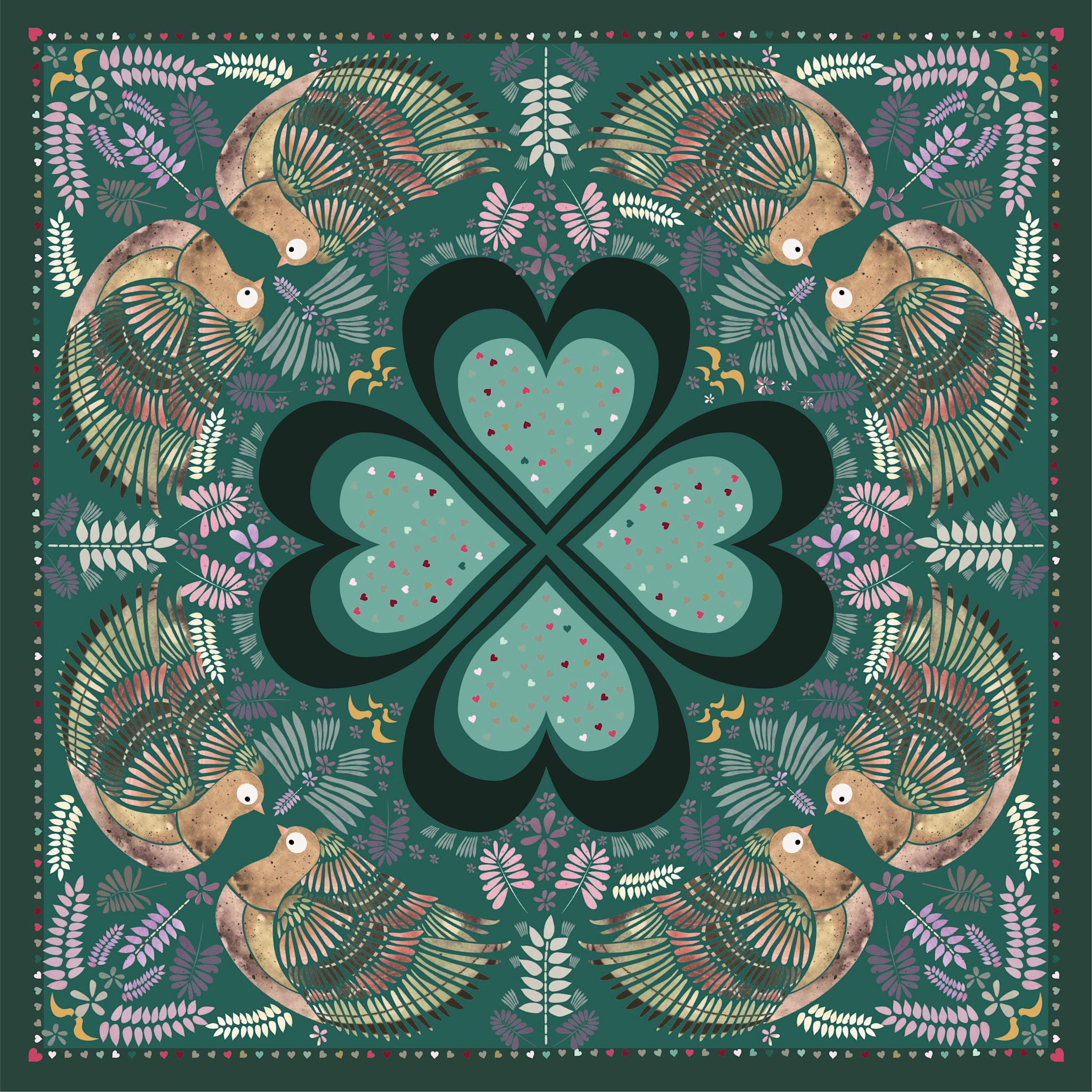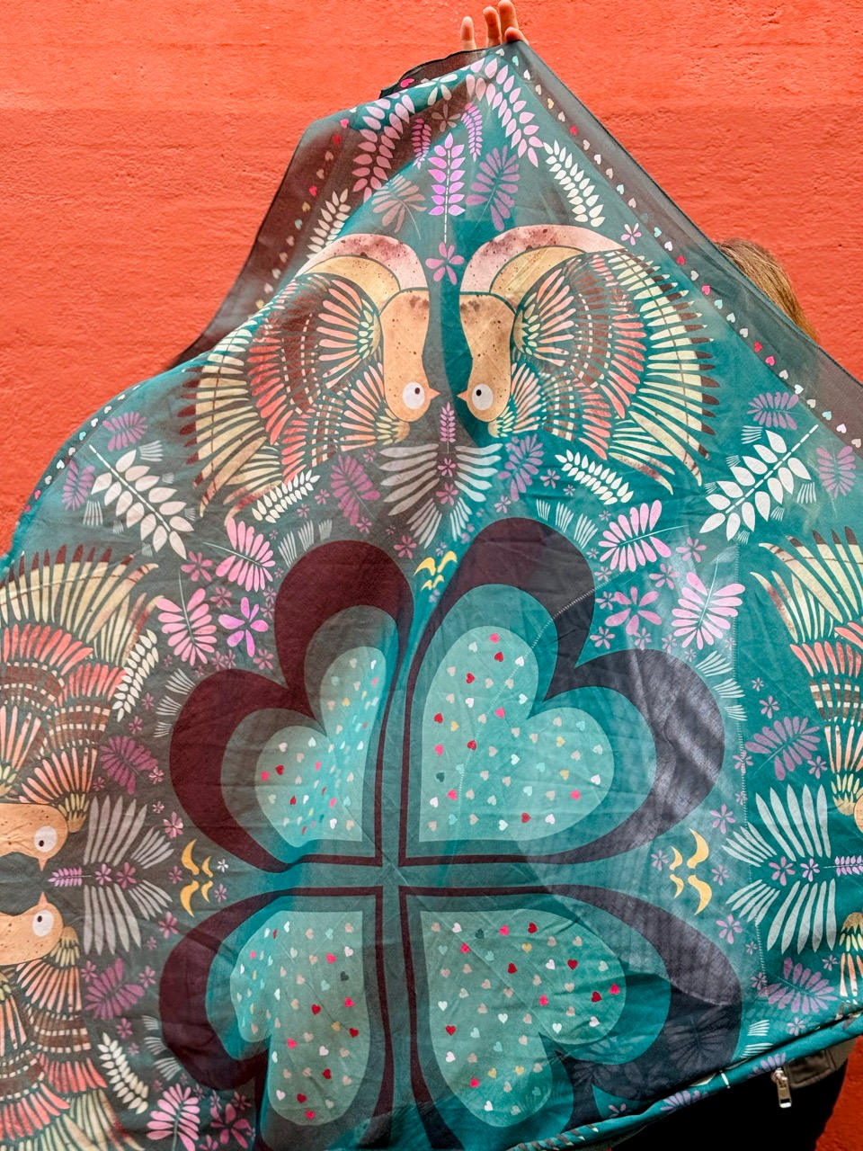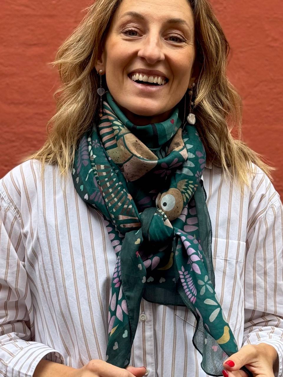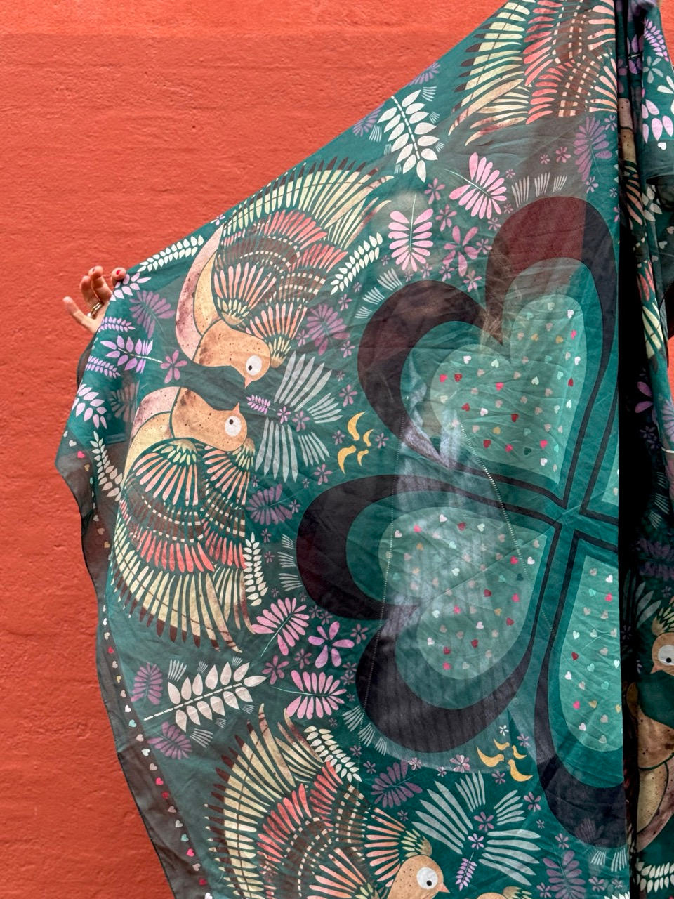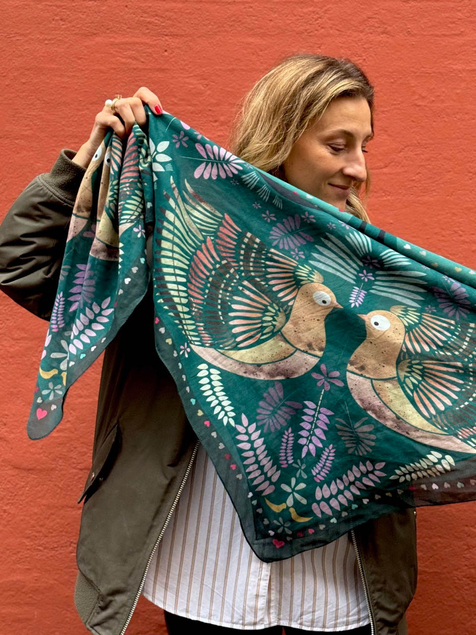 En skøn kombination af smukke grønne nuancer, smukt udsmykket med elegante motiver i de fineste farver. Et perfekt tørklæde til efterårsmånederne, da det er lunt, 100% naturligt og lækkert i kvaliteten. Det er dejlig blødt og lunt at have om halsen eller hen over skuldrene i de kølige måneder, fordi det er i blød bomuld.